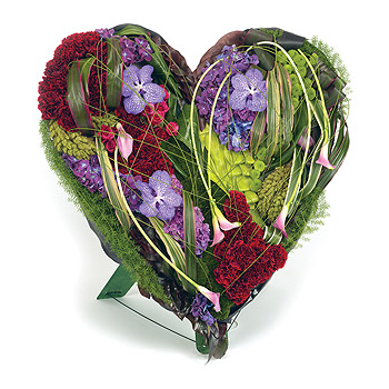 Titan Heart, in shades of mauve and lilac including Calla Lilies, Hydrangea, Vanda Orchids and Aspidstra. Size: Height - 75cm (30").