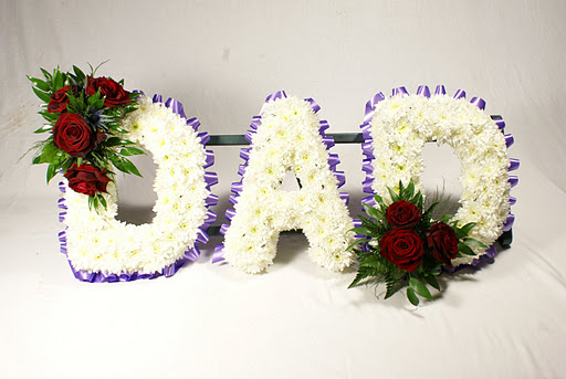 Tribute letters made up of white chrysanthemum with a purple ribbon edge, finished with elegantly completing corsage spray of red roses.