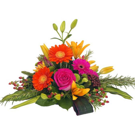 A charming mixed arrangement featuring pink Roses, orange Lilies, Gerbera and Chrysanthemums. Flowers are arranged in floral foam in a green plastic container for long lasting freshness and easy display.