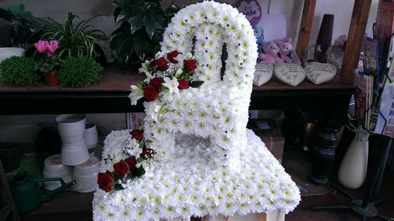 A vacant chair massed with white arctic queen spray chrysanthemums, finished with grand prix red rose corsage's.