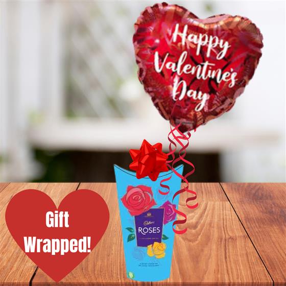 Gift wrapped together with a bow this thoughtful set comes with a box of roses chocolates and a valentines day helium balloon.