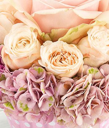 A delightfully delicate, light pink Rose and Hydrangea cupcake inspired container arrangement.