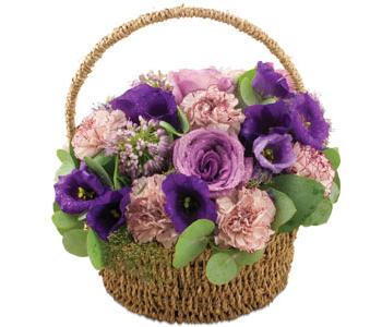 Traditional flowers including carnations and roses make up this pretty vintage coloured flower basket, edged with eucalyptus.