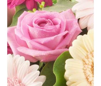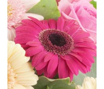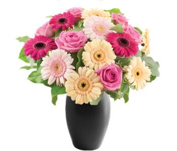A contemporary mix of mini gerberas and roses, in shades of pink, cerise and peach, interspersed with greenery. The perfect marriage of colour.
