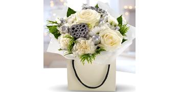 Neutral tones make up this winter wonderland. Roses, Carnations and Chrysanthemum are exquisitely combined with silver baubles and Lotus seed heads. A stunning Christmas gift bag, tis petite Bouquet is sure to complete any room.