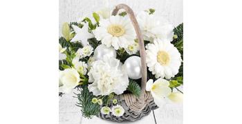 An elegant basket of pretty winter white's, Creams and Silver's come together to create this classy Christmas arrangement.