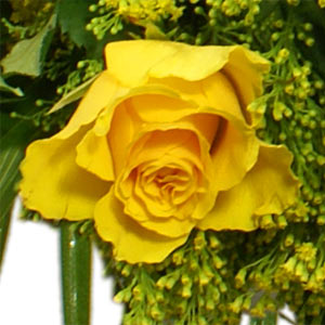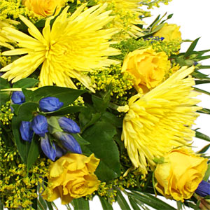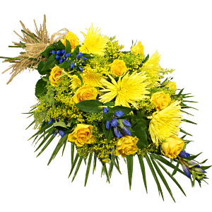 A beautiful array of golden yellow fresh flowers, this spray of flowers has been lovingly designed using yellow roses, huge golden yellow blooms, luxurious palm leaves and masses of delicate gold solidago. This rich yellow collection has then been scattered with a few subtle stems of blue gentian to complete the display.
